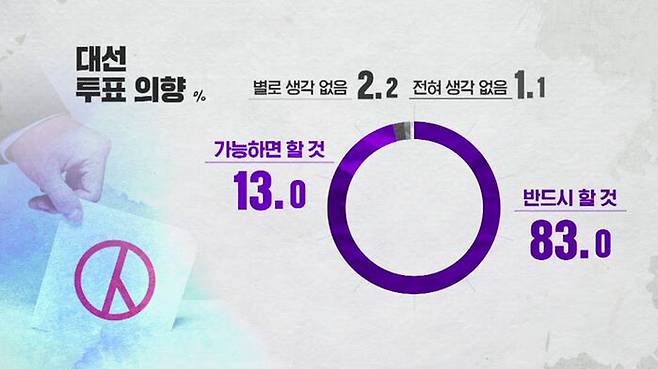 투표 의향은 적극 투표층 83%를 포함해 96%에 달했는데,