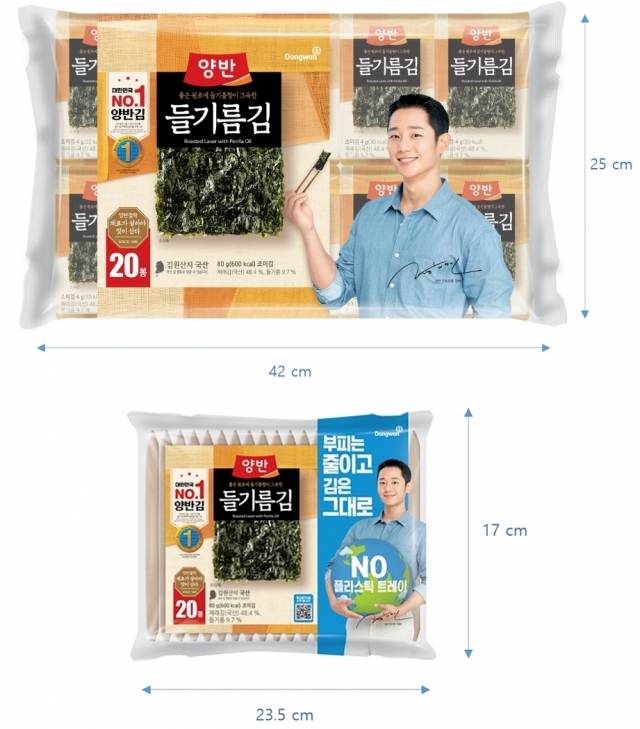 이에 비해 2020년 7월 출시한 양반김 에코패키지는 용기가 아예 없다. 용기를 빼고 나니 제품의 부피는 기존 패키지보다 절반 이상 줄었다. 20봉지 묶음 상품 기준으로 배출되는 쓰레기는 기존 패키지가 149g, 에코패키지는 55g에 불과하다.