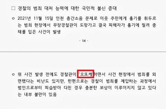 19일 정치권에 따르면 윤 후보가 최근 발표한 사법개혁 보도참고자료에서는 ‘오또케’라는 단어가 적혀 있어 논란이 됐다. 경찰의 범죄 대처 능력에 대한 국민적 불신이 증대되고 있다며 소개한 사례에서 ‘경찰관이 '오또케' 하면서 사건 현장에서 범죄를 외면했다는 비난도 있다’고 했다. ‘오또케’라는 표현은 ‘어떡해’의 변형으로 위급 상황에서 대처를 못한다는 의미로 여성 경찰을 비하하는 단어다.