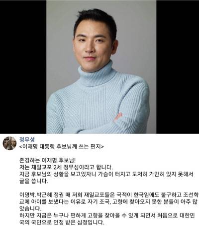 정무성은 이어진 글에서 “이국 땅에서 피눈물 울리면서 지켜온 우리 조국의 국적! 저는 이재명 대통령님이 계시는 조국에서 살고 싶다”는 희망을 전하면서 글을 마무리 지었다.