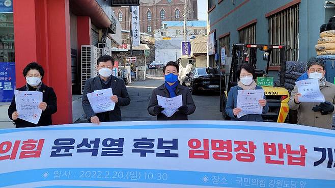 이른바 '국민의힘 윤석열 임명장'을 받은 더불어민주당 강원도당 당원 등이 오늘(20일) 오전 국민의힘 강원도당 앞에서 반납 기자회견을 하고 사과와 재발 방지를 촉구했습니다.