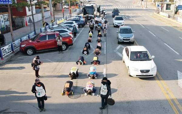 "대선 후보, 탈석탄 공약하라"는 구호에 맞춰 징이 울리고 사람들이 무거운 세 걸음을 걷고 무릎을 꺾어 땅바닥에 엎드렸다. 개인적으로, 지루할 것 같다고 못마땅해했던 삼보일배 행진이었지만 막상 걷는 동안에는 몇 번이나 울컥이는 마음을 억눌러야 했다. 기후 재앙에 맞서 무엇이라도 해야겠다는 시민들의 행렬, 지역의 평화를 지키려는 시민들의 행렬에 '정치'가 없었다. 시민들이 찬 바람을 맞으며 외로운 삼보일배를 이어가며 우리의 존엄함을 지켜내는 동안 대선 후보들은 어디에 가 있단 말인가.