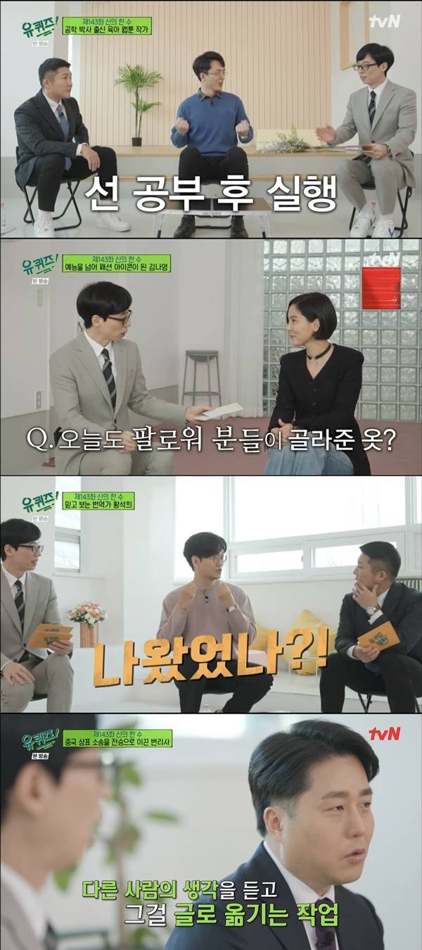 23일 방송된 tvN 예능프로그램 '유 퀴즈 온 더 블럭'(이하 '유퀴즈')에서는 인생의 판을 뒤흔든 '신의 한 수' 특집으로 꾸며진 가운데 공학박사 출신 웹툰 작가, 방송인 김나영, 번역가 황석희, 유성원 변리사가 유퀴저로 출연했다.