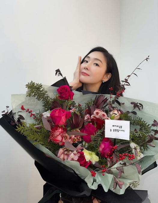 꽃다발을 들고 있는 다른 사진에서는 꽃받침 포즈도 취하며 귀여운 매력도 드러냈다.
