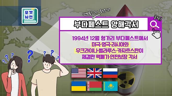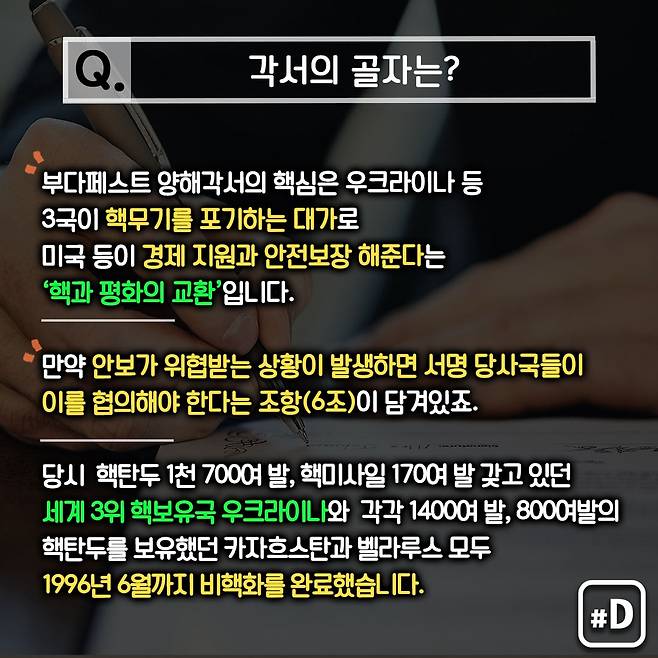 이 양해각서는 옛소련 해체 3년 뒤인 1994년 12월 헝가리 부다페스트에서 미국·영국·러시아와 옛소련에 속했던 우크라이나·벨라루스·카자흐스탄 대표가 체결한 것입니다.
