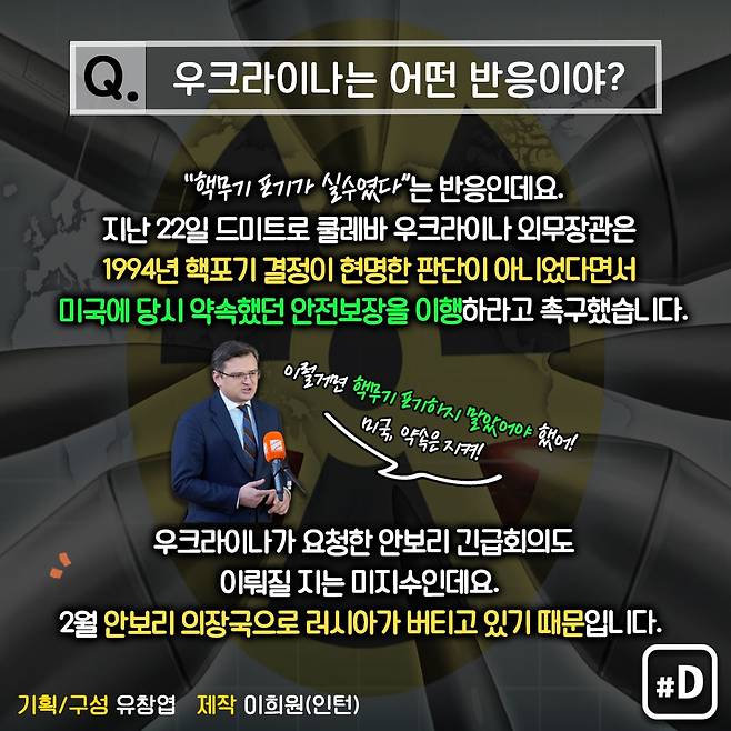 핵무기 포기가 실수였다는 정서는 여전합니다. 지난 22일 드미트로 쿨레바 우크라이나 외무장관은 미국 폭스방송에 출연해 1994년 핵포기 결정이 현명한 판단이 아니었다면서 미국에 당시 약속했던 안전보장을 이행하라고 촉구했습니다.