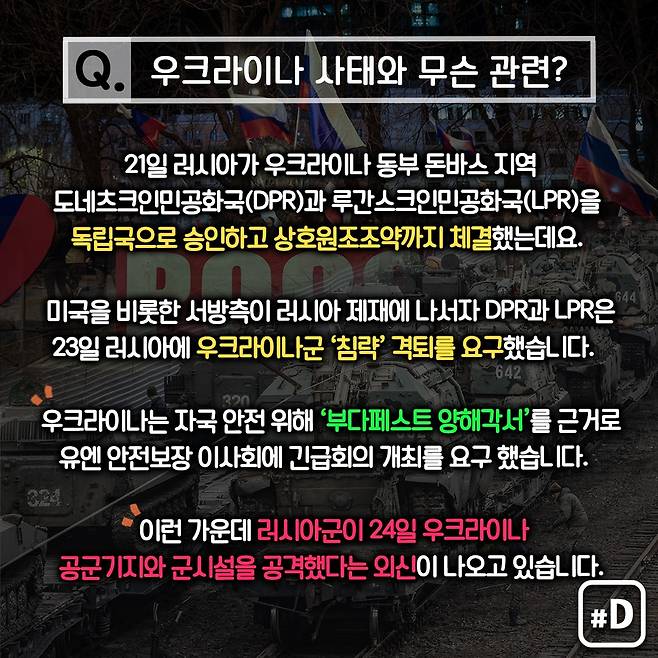 그러자 돈바스 지역의 자칭 도네츠크인민공화국(DPR)과 루간스크인민공화국(LPR)은 지난 23일 러시아에 우크라이나군 '침략'을 격퇴해달라고 요청했습니다.