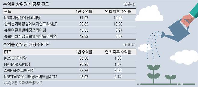 배당주 펀드 중에서는 석유, 가스 등 에너지 관련 상품의 가격 상승세가 돋보인다. 'KB북미생산유전고배당'은 올 들어 19.92% 수익률을 올렸다. 미국과 캐나다에 상장된 생산유전 관련 자산에 투자하는 상품으로, 최근 러시아와 우크라이나 분쟁 가능성에 유전 관련 종목 주가가 급등하며 높은 수익을 거뒀다. MLP(유가 연동 미국 마스터합자회사)에 투자하는 고배당 펀드 수익률도 좋았다. '한화분기배당형에너지인프라MLP'는 연초 이후 10%대 수익률을 기록했다.