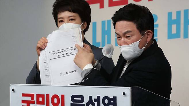원 본부장은 오늘 오전 여의도 당사에서 '대장동 관련 긴급 기자회견'을 열고 해당 보따리가 대장동 개발사업 당시 성남도시개발공사 전략사업팀장이던 정민용 변호사 소유로 추정된다고 밝혔습니다.