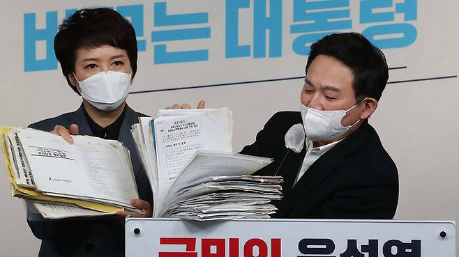 원 본부장은 "대장동 일당의 2020년 10월 30일 이른바 '노래방 녹취록'에 따르면 김만배가 '민용이도 100억'이라고 했다"며 "정 변호사의 100억 원 대가가 이재명 대면 결재 서류에 나온다"고 주장했습니다.