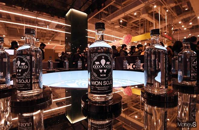 25일 서울 영등포구 더 현대 서울에서 열린 '원소주(WONSOJU)' 팝업 스토어 오픈 행사에서 원소주가 진열되어 있다.