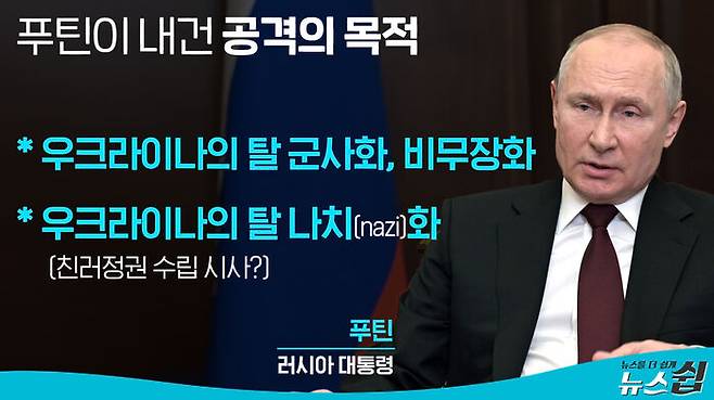 그런데도 푸틴이 이런 주장을 하는 것은 러시아와 우크라이나가 2차대전 당시 나치 독일에게 입은 피해가 워낙 컸던 탓이다. 이런 거짓 선동을 믿는 사람들이 더러 있다는 것이다. 푸틴은 소련이 수백만의 인명피해를 감수하며 나치와 혈투를 벌이는 동안 서방은 수수방관했다고 생각하며, 2014년 우크라이나에서 친러 독재자가 민주화시위 끝에 쫓겨난 일도 친서방 네오나치에 의한 정권찬탈이라고 우기고 있다. 그래서 푸틴이 침공의 목적 중 하나로 ‘탈 나치화’를 내건 것은 심상치 않다. 우크라이나의 젤렌스키 정부를 무너뜨리고 친러시아 정부를 세우겠다는 시사로 읽히기 때문이다.