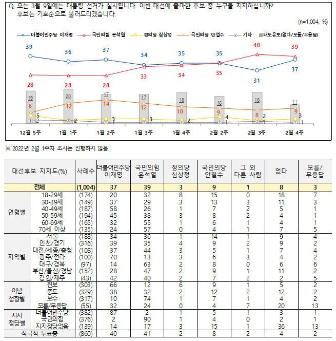 자, 그래서 이번 대선은 어떻게 될까요? 최근 여론조사를 보면 대부분 윤석열 후보가 오차범위 이내에서 이재명 후보를 앞서고 있습니다. 그러나 두 사람의 격차가 급격히 줄어드는 추세입니다. 2월24일 발표한 전국지표조사(NBS)는 윤석열 39%, 이재명 37%입니다. 일주일 전에는 40% 대 31%였습니다.(중앙선거여론조사심의위원회 누리집 참고)