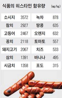 식품이 피부 가려움증을 유발할 수 있다. 식품 속에 든 '히스타민' 때문이다. 히스타민은 히스티딘이라는 아미노산이 바뀐 물질로, 비만세포 등에 있으면서 알레르기나 염증 반응에 관여한다. 히스타민은 식품 속에도 있다. 한림대 강남성심병원 피부과 연구팀이 한국인이 자주 섭취하는 식품 29가지를 분석한 결과, 소시지에 히스타민이 가장 많았다. 그 다음으로 참치에 많이 들었고 고등어, 꽁치, 돼지고기, 삼치, 시금치의 순이었다.<표>