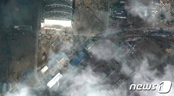 (호스토멜 AFP=뉴스1) 우동명 기자 = 27일 (현지시간) 우크라이나 수도 키예프 외곽 호스토멜에 있는 안토노프 공항이 러시아 군의 공습으로 연기가 솟아오르고 있다.