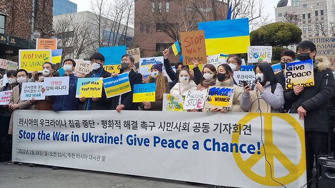 참여연대·전쟁없는세상·민주노총 등 약 400개 시민사회단체는 오늘(28일) 오전 서울 중구 주한 러시아대사관 앞에서 공동 기자회견을 열고 러시아 측에 우크라이나 침공 중단을 촉구하면서 국제사회의 신속한 인도적 지원을 강조했습니다.