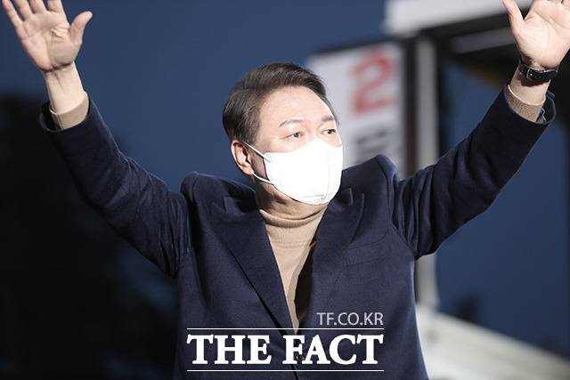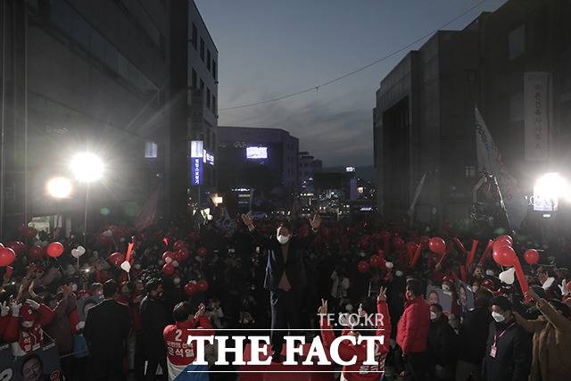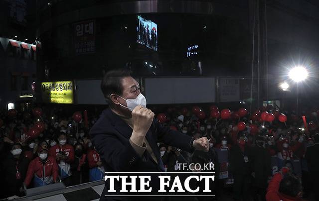 [더팩트|이선화 기자] 윤석열 국민의힘 대선 후보가 28일 오후 강원도 춘천시 춘천시청 앞에서 열린 '강원도 수부도시 춘천의 위대한 선택, 정권교체!' 강원 춘천 유세에서 지지를 호소하고 있다.