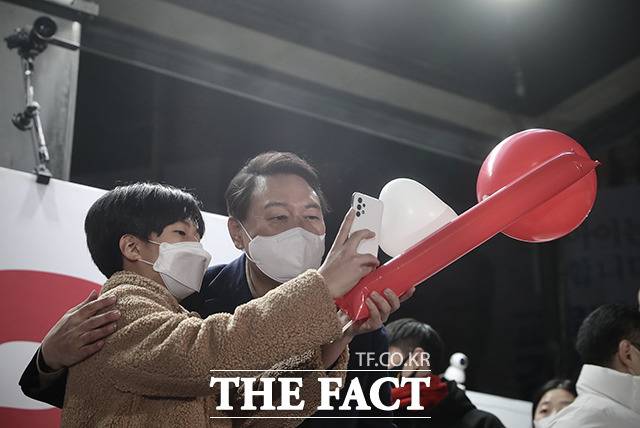 윤석열 국민의힘 대선 후보가 28일 오후 강원도 춘천시 춘천시청 앞에서 열린 '강원도 수부도시 춘천의 위대한 선택, 정권교체!' 강원 춘천 유세에서 지지를 호소하고 있다.