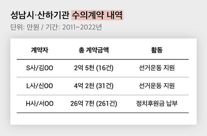 신 씨는 L사라는 회사를 설립한 뒤 2014년 5월부터 2017년 6월까지 최소 31건의 수의계약을 성남시 등과 체결했다. 계약 명목은 ‘삶의 질 세계100대 도시 지표를 활용한 인포그래픽 제작’, ‘공무원 안전체험 교육’, ‘금연사업 홍보물품 제작’ 등으로 다양하다. 계약금 총액은 4억 2000여만 원이다.