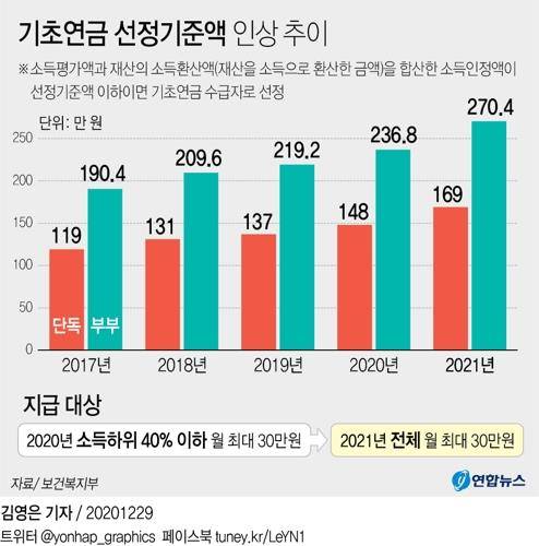 이를테면 올해 기초연금 선정기준액은 월 소득인정액이 노인 단독가구는 180만원 이하(부부가구는 288만원 이하)이다. 이 기준에 따라 소득인정액 179만원인 A씨는 기초연금을 전액(30만원) 받으면 총소득이 209만원(소득인정액 179만원 + 기초연금 30만원)으로 올라간다.