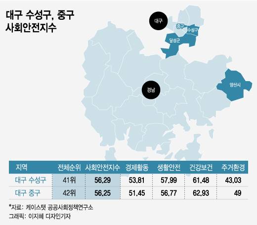 정진우 케이스탯 이사는 "수성구와 중구 모두 주민들의 설문조사가 실제 정량지표보다 높았다는 특징이 있다"라며 "수성구의 경우 '대구의 강남'이라는 생활 수준이 높다는 자부심, 중구는 주요기관들이 자리해 있고 원도심에 살고 있다는 심리가 작용했다고 볼 수 있다"고 분석했다.