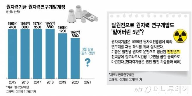 현 정부 탈(脫)원전 여파로 매년 2000억원가량 조성되던 '원자력연구개발기금(이하 원자력기금)'이 2019년 1808억원을 시작으로 2020년 1620억원으로 급감한 것으로 확인됐다. 미래 원자력 연구개발(R&D)에 쓰일 기금은 2년간 총 500억원 이상 줄어들었고, 2021년분 기금 역시 원전가동 하락세로 300억원 가량이 줄어들 것으로 보인다. 탈원전 정책 여파로 R&D 재원이 약 800~900억원 가량 증발하는 셈이다.