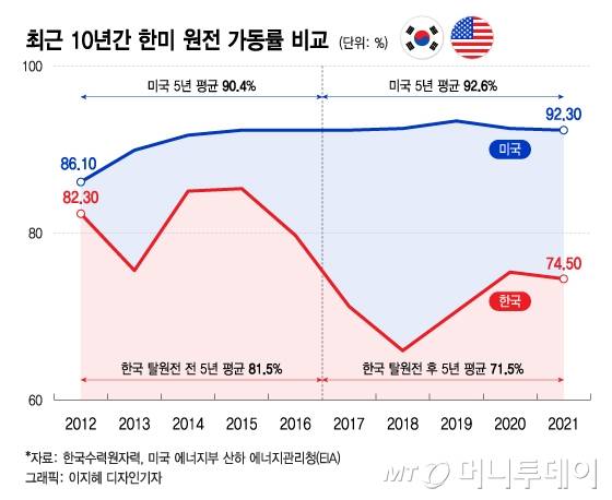 반면 미국은 한국과 달랐다. 미국 에너지부 산하 에너지관리청(EIA) 통계에 따르면 미국 원전 이용률(NCF)은 최근 10년간 평균 90% 이상을 유지했다. 국가 백년대계인 에너지 정책이 정권과는 무관하단 뜻이다.