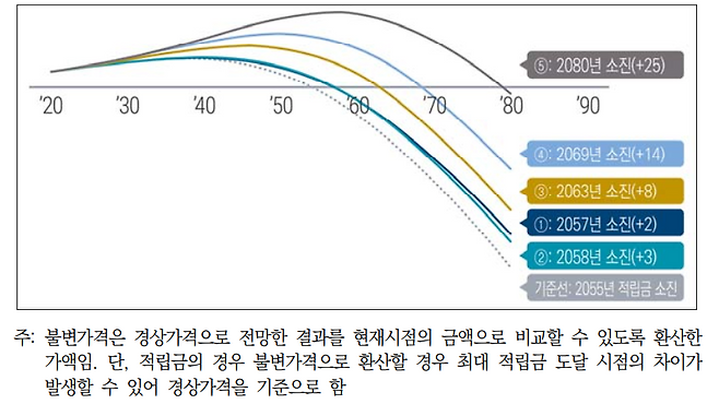 시나리오①은 연금 수급 연령만 늦춘 것이기 때문에 개선 폭이 크지 않지만, 보험료율을 높이는 시나리오③, ④, ⑤의 경우엔 개선 폭이 컸고, 특히 시나리오⑤의 경우 적립금의 소진 시기도 기존보다 25년이나 늦출 수 있었다.
