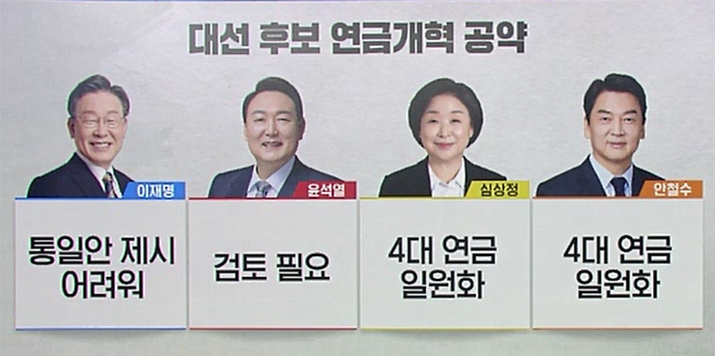 지난달 3일 1차 TV 토론에서 대선 후보 4명이 모두 동의한 공약이 있다. 바로 연금 개혁이다. 당시 국민의당 안철수 후보가 "누가 대통령이 돼도 국민연금 개혁을 하겠다, 이렇게 네 명이서 공동선언하자"는 제안을 했고. 민주당 이재명 후보는 "좋은 생각입니다", 국민의힘 윤석열 후보도 "이 자리에서 약속을 하지요. 안 할 수 없으니까. 선택이 아니니까"라고 말했다. 정의당 심상정 후보는 별다른 언급 없이 웃으며 화답했다.