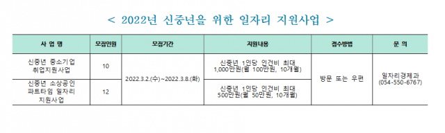 경북 문경시는 중소기업과 소상공인의 인력난 해소와 취업장려를 위해 ‘신중년 일자리 지원사업’ 참여자를 3월 8일까지 모집한다.