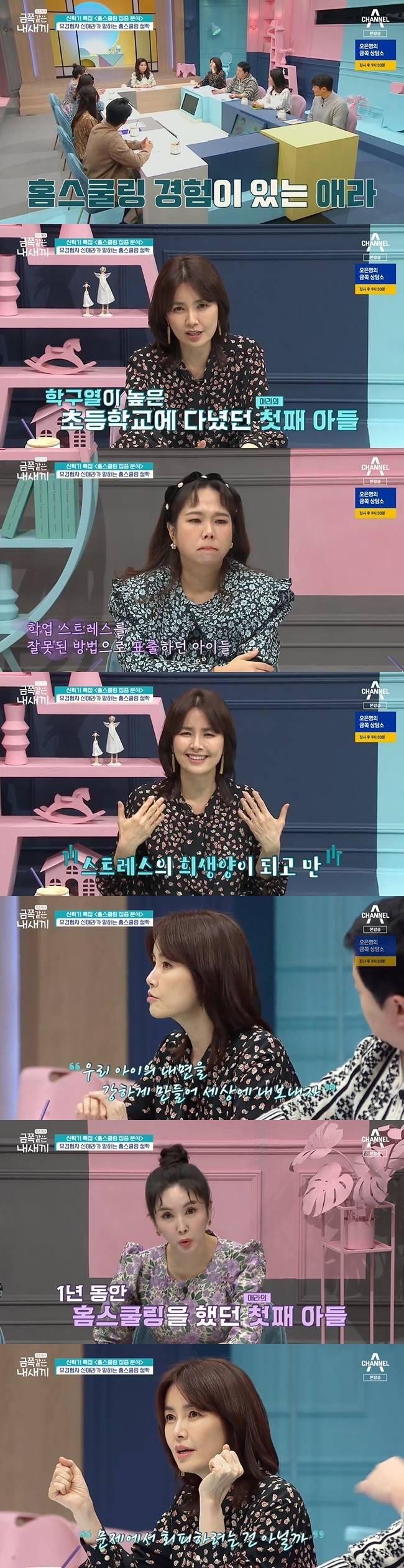 장영란은 홈스쿨링 경험이 있는 신애라에게 홈스쿨링을 하게 된 배경에 대해 물었다. 신애라는 “아들이 굉장히 좋은 초등학교를 다니고 있었다. 그러다 보니 아무래도 부모님 학구열이 강한 분들이 있으셨던 것 같다. 그랬더니 아이들이 자기 스트레스를 친구들한테 표현을 했다. 내가 볼 땐 초등학생이 할 행동을 넘어섰다”라며 “그걸 우리 아들이 그대로 당하는 입장이었다”라고 설명했다.