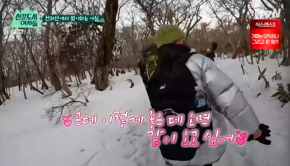 부지런히 산을 오른 이들은 오전 10시 30분. 진달래밭 대피소에 도착했다. 이들은 발열 도시락과 라면으로 든든히 속을 채웠다. 김지석은 "여기가 중간지점이냐"고 물었고 한선화는 "지금 온 만큼만 더 가면 된다"고 답했다.