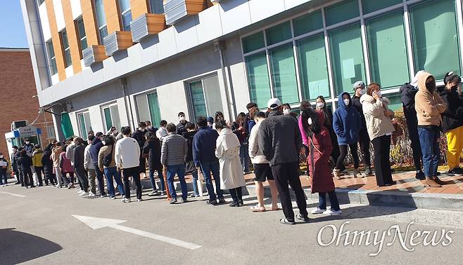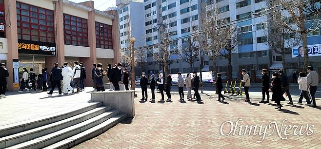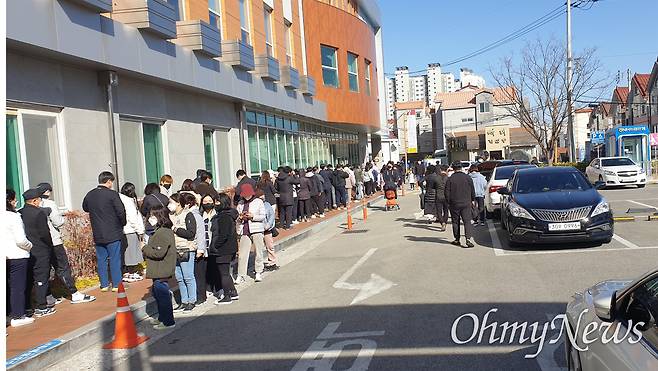 | ▲ 김해 장유3동 행정복지센터에 마련된 사전투표소에 5일 오후 투표하기 위해 사람들이 길게 줄을 서 있다. |