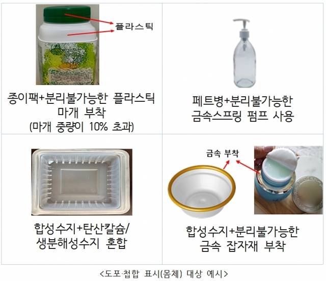 구체적으로는 ▲종이팩에 분리할 수 없는 중량 10% 이상의 플라스틱 마개를 부착한 포장재 ▲페트병에 분리 불가능한 금속 스프링 펌프를 사용한 경우 ▲합성수지에 분리가 안 되는 금속 접착제를 붙인 포장재 ▲합성수지에 탄산칼슘 등 다른 재질을 혼합한 포장재 등이 해당합니다.