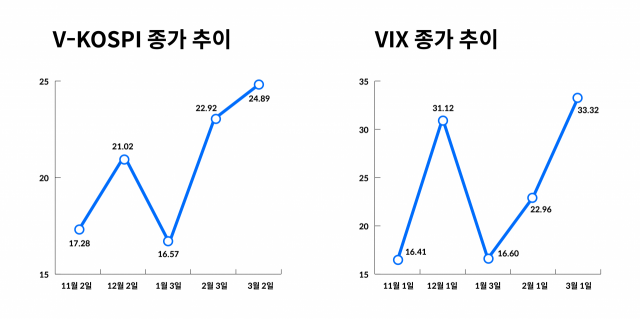 그럼 이런 지수를 어떻게 헤지 수단으로 활용할 수 있을까요. 바로 공포지수 관련 상품에 직접 투자하는 겁니다. 불안이 커지는 방향에 베팅하는 거죠. 국내에서는 V KOSPI 선물과 미국 S&P500 VIX선물 ETN(상장지수증권)이 상장돼 거래되고 있습니다. 실제로 최근 이 두 상품이 얼마나 올랐는지 확인해 보면 V KOSPI 선물은 2월 말 기준 연초 대비 64%, VIX ETN은 같은 기간 47% 상승했습니다.