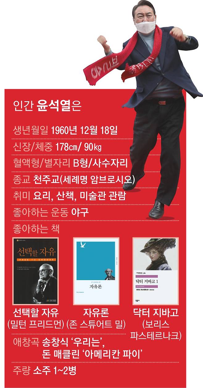 외적으론 ‘강골’ 이미지인 윤 후보는 의외로 요리, 미술관 관람과 같은 ‘내향적인’ 취미를 갖고 있다. 그는 대선 주자가 되기 전 서초동 자택 인근의 S백화점 지하 식료품 매장에서 요리를 위해 자주 장을 봤고, 전시기획사 코바나컨텐츠 대표인 부인 김건희씨를 만나 결혼하기 전 지인에게 소개받은 인사 중에는 현재 수도권의 한 국공립미술관장으로 있는 문화계 인사도 있었다고 한다.