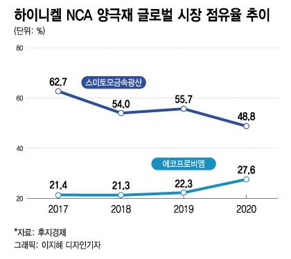 7일 배터리 업계에 따르면 에코프로비엠은 하이니켈 NCA(니켈·코발트·알루미늄) 양극재 시장에서 글로벌 점유율 2위를 기록중이다. 일본 후지경제 조사에서 해당 시장 점유율 1위 기업은 일본 스미토모금속광산(SMM)으로 지난 2020년 점유율은 절반에 육박하는 48.8%다.