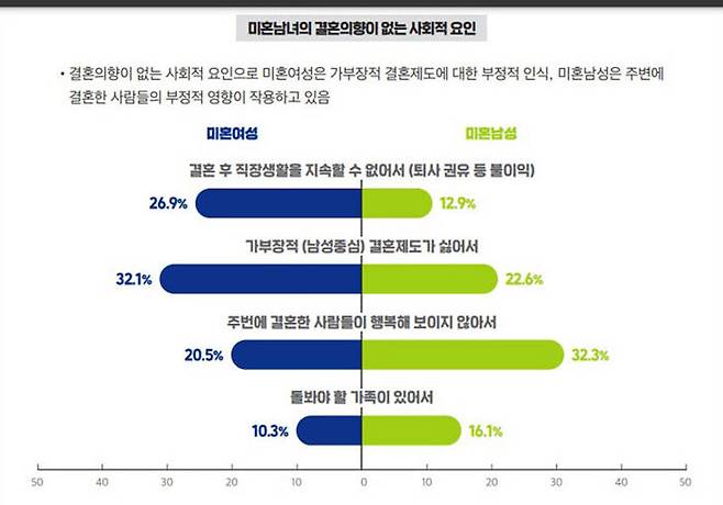 여성은 '가부장적 결혼제도가 싫어서'가 32.1%로 가장 많았으며, '결혼 후 직장생활을 지속할 수 없어서' 26.9%, '주변에 결혼한 사람들이 행복해 보이지 않아서' 20.5%, '돌봐야 할 가족이 있어서' 10.3%였습니다.