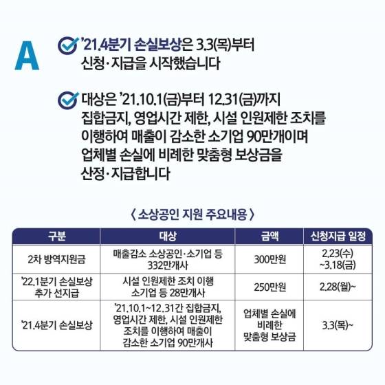 ’21.4분기 손실보상은 3.3(목)부터 신청·지급을 시작했습니다. 대상은 ’21.10.1(금)부터 12.31(금)까지 집합금지, 영업시간 제한, 시설 인원제한 조치를 이행하여 매출이 감소한 소기업 90만개이며 업체별 손실에 비례한 맞춤형 보상금을 산정·지급합니다.