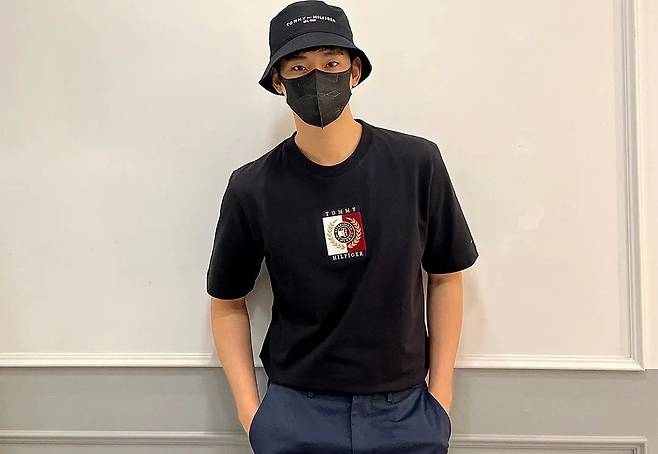 사진 속 김수현은 블랙 티셔츠에 네이비톤 팬츠를 매치한 일상룩을 선사했다.