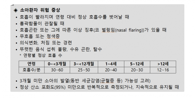 대표적인 호흡 곤란의 신호를 알고 있으면 좋습니다. 숨을 쉴 때 쇄골 위와 가슴이 들어가는 흉부함몰, 울고 보채지 않을 때도 들리는 꺽꺽거림, 코 벌렁거림 등이 나타날 때는 호흡 곤란으로 판단하고 즉시 대면진료 혹은 119를 통한 응급처치를 받아야 합니다.