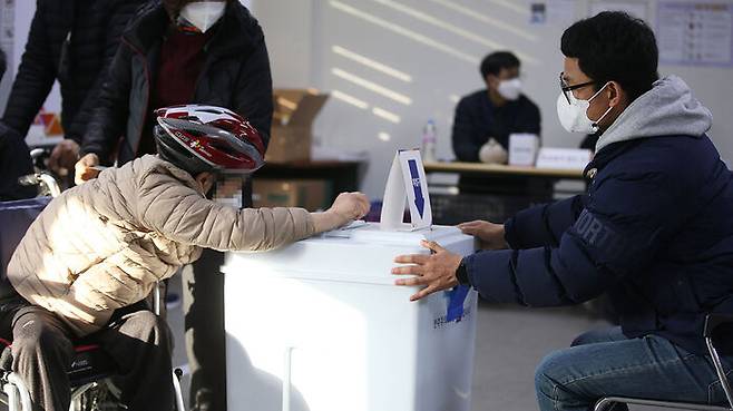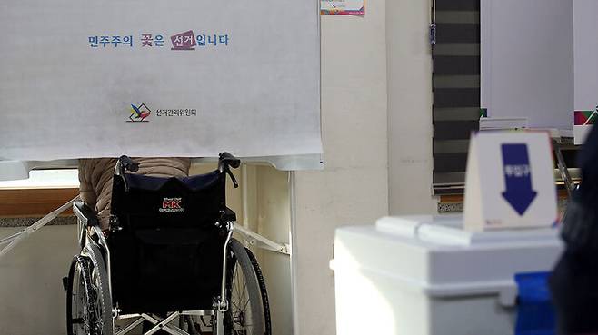 전북 전주시 전북장애인복지관 투표소를 찾은 장애인들이 투표하고 있다.