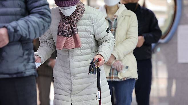 경기도 안양시 동안구 해오름초등학교에 마련된 관양1동 제7투표소에서 지팡이를 짚은 한 노인이 투표 차례를 기다리고 있다.