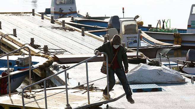 전남 신안군 압해면 우간도 주민이 귀중한 한 표 행사를 위해 배를 타고 나와 압해읍 나룻가선착장에 내리고 있다.