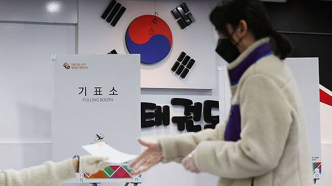 서울 강서구 현대태권도 체육관에 마련된 화곡8동 제5투표소에서 유권자들이 투표하고 있다.