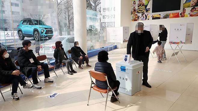 인천시 미추홀구 한 자동차 판매 영업점에 마련된 투표소에서 시민들이 투표하고 있다.