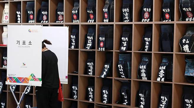 부산 수영구 백호검도관에 차려진 남천제2동 제3투표소에서 유권자들이 소중한 한표를 행사하고 있다.