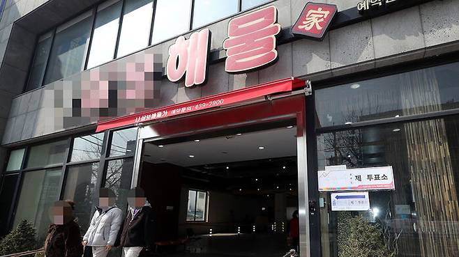 인천시 미추홀구 한 해물음식점에 마련된 투표소 외벽에 투표소 안내문이 부착돼 있다.