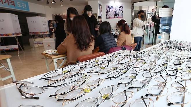 서울 광진구 한 안경점에 마련된 화양동 제5투표소를 찾은 시민들이 투표 안내를 받고 있다.