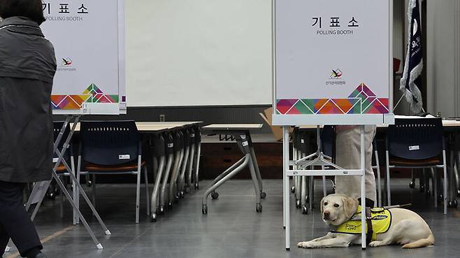 한남동 투표소에서 한 시각장애인 안내견이 투표를 기다리고 있다.